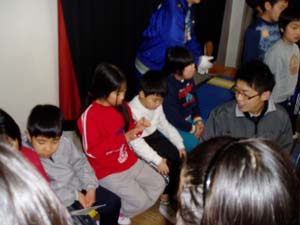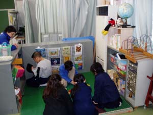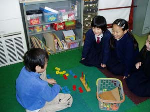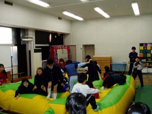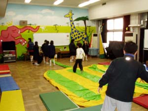 | エアマットで喜ぶ4年生 | いっしょに積み木で遊びましょうね |
