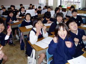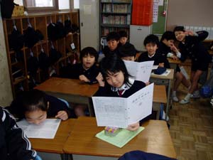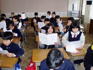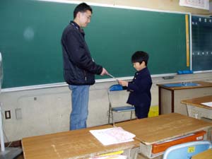 | 教室にもどって「あゆみ」をもらいます。 | 真剣に見ている表情を作ってもらいました。 |
