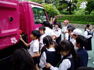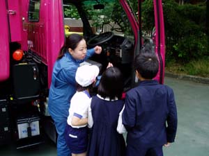 | ゴミ収集体験もさせてくれました。 | これが、緊急停止ボタンだよ。 |