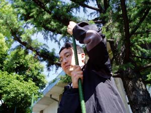 | 今日は、管理者の姿も載せましょう。 | 真剣に支柱を立てる様子です。 |