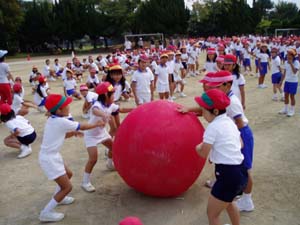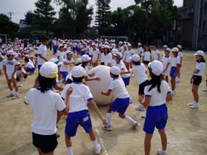 全校練習では、始めの体操、終わりの体操、全校大玉おくりの練習でした。