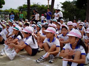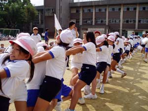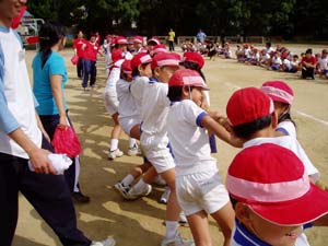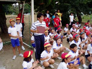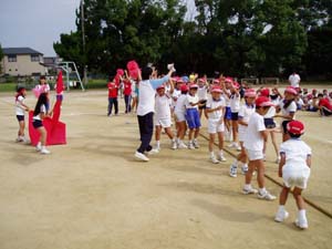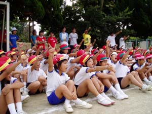 | リハーサルでは赤組が勝ちました。 | 間地先生の応援もヒートアップ |