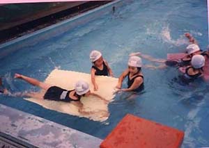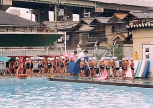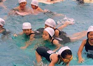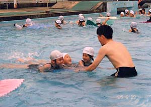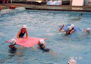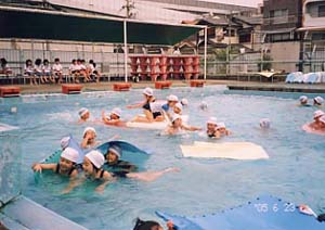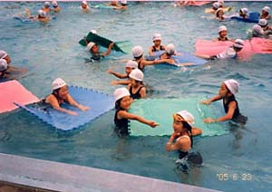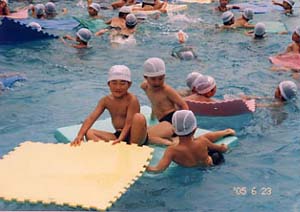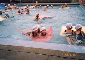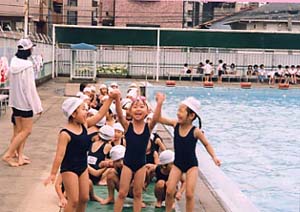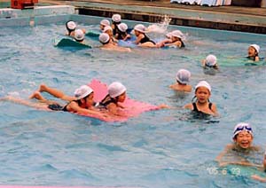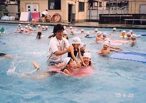 たのしく プールで あそぶなかで もぐったり ぷかぷか ういたりすることを もくひょうに がんばりました。
