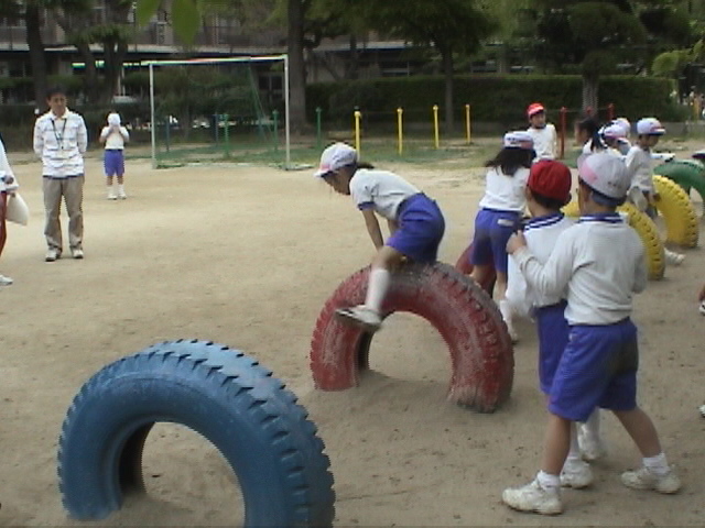 ロケットタワーでの 身体を支えるという 感じを生かして タイヤ跳びをやってみよう |