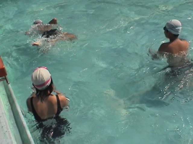 平泳ぎの足を見てもらっています。泳ぎ終わるとすぐにバディからアドバイスをもらえます。