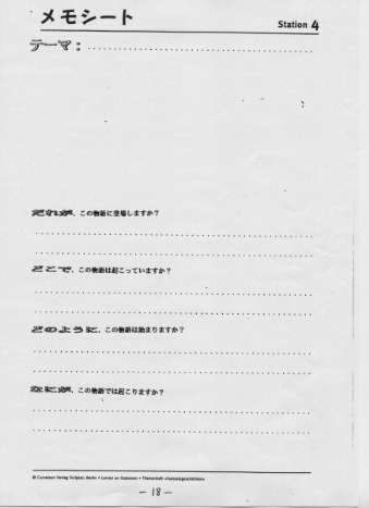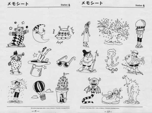2.ワークブックの分析 2−1.ステーション学習とは(→資料はこちら) 今回のワークショップを行うときに取り扱ったのが、クリスティアーネフルヒナーの、『第3・4学年における自由に書くこと:想像物語』です。このワークブックはステーション学習というシリーズの中の分冊として位置づけられているものですが、ステーション学習とは、1つの大きな目標を達成するために、その目標を一つ一つの小さな部分(ステーション)に分け、まるで駅のように立ち止まりながらその部分の強化(練習)をします。プログラムされた段階を追って、順番通りに、または自由選択的に1つ1つのステーションを経験することによって、最終的に1つの大きな目標を達成することができるのだと考えられているのです。資料1の下線Aを見てください。そこに書かれているように、このステーション学習は4つの目標の方向性をもっています。1つ目に、いろいろな視点から構想された課題や支援によって子どもに最適な練習を可能にすること。2つ目に、子どもが自発的に自分の可能性や能力に応じて1つのテーマに取り組むこと。3つ目に、子どもが作業を通して物事を探求、経験して、その物事を自発的に加工・処理すること。4つ目に、多様な見方を伴う課題や、教科をまたぐ課題(教科書やマスメディア)に対して、子どもたちが全体的な観察の仕方で加工・処理すること。以上のような目標の方向性を持っているステーション学習は、我が国の総合的な学習に類(相当)するものだといえます。 2−2.本テーマ分冊に対する一般的手引き そのステーション学習の一つの分冊として刊行されている『想像物語』は、国語科の中で位置づけられているのですが、子どもたちに美的で創造的な学習活動を可能にするため、下線Bのような観点が顧慮されています。そこには9つの観点が挙げられていますが、私たちが活動を通して重要だと感じたものについていくつか紹介していきます。 芸術科、音楽科の領域との重なり合いをもちながら広く扇状化された多様性および統合的国語科教育を提供すること。語や文との遊技的交流を、小さな部分的テクストや創造的な短いテクストを経て、文量のある想像物語へと段階的に構築すること。活動形式や社会的形式を交換するようなメニューを提供すること。絵や写真、色彩、想像力を刺激する人形や素材などを用いて、ステーションの美的形成に注意を払うこと。この9つの観点に基づいて設定されたのが、資料1の下線Bの下の方に挙げられている12のステーションからなる活動です。 2−3.全体の説明 この12のステーションは、想像物語を書くという1つの全体的な目標に向けての小さな部分となっています。そしてさらに、この12ステーションは、3段階に分かれており、目標に向けてのステップになっているといえます。 1つ目の段階は、資料1に表示されているように、準備的練習であるといえます。言葉(単語)を次々と出していく活動や、単語をつなげて文を作る活動など、文章を書いていく上で基礎となる段階だといえます。 2つ目の段階は、1段階目の活動(文と文のつながりなど)をふまえ、小さな部分的テクスト、創造的な短いテクストを書く段階です。物語の1部分を自分が受け持って書いたり、小さな物語を書いたりと、1段階よりも書く量が少し増え、物語の構成を重視するような活動がでてきます。これは、次の3段階目に引き継ぐための重要な段階になっていると考えます。 3つ目の段階は、いよいよ物語を実際に自分で作っていきます。物語を書くために与えられるいろいろな材料から、今までのステーションで培った力を総動員して物語を書いていきます。 ナンバー2の資料2をごらんください。先程述べたような観点を持って構想されたワークブックを用いたワークショップは、このようなプログラムで行いました。このプログラムの順序に従って、ワークショップの実際の活動と結びつけながら、その具体的な方法と、その活動の特質についての考察を報告させていただきます。