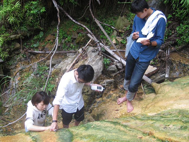 採水した温泉水は、アルカリ度、塩化物などの陰イオン濃度、金属イオン、酸素安定同位体比などを測定します。