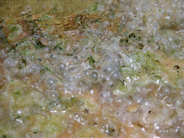 努力の証、沈殿物がフィルターに詰まっているのが見えます。藻類の光合成でできた酸素のバブル表面に、炭酸カルシウムの皮膜ができています。