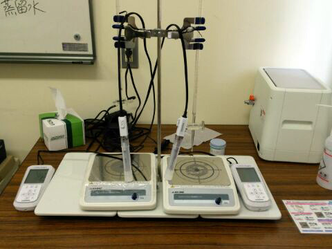 左)アルカリ度測定のための中和滴定装置。HORIBAのpHメーターを2台使い、2試料同時に滴定します。3回生もだいぶ操作に熟達してきました。