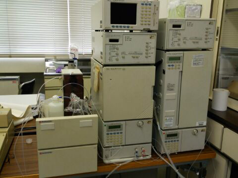 右)島津製イオンクロマトグラフも、システムの修理は完了しています。これはデュアルインレットシステムになっており、オートサンプラーから陰イオンと陽イオンが同時分析できます。今年度中に陽イオンカラムは買えそうにないので、陰イオン測定からぼちぼち始めていきましょう。