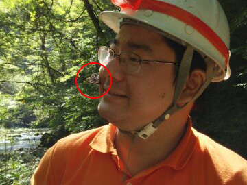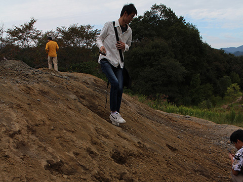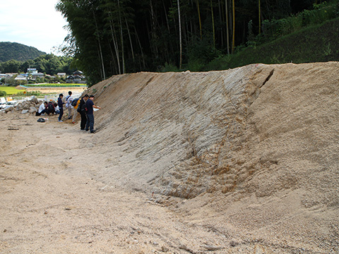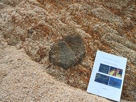 3日目も風化花崗岩路頭の観察です。massiveな花崗岩が、土になっていくまでの形態が連続的に観察できます。右は、風化花崗岩の中の捕獲岩。