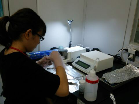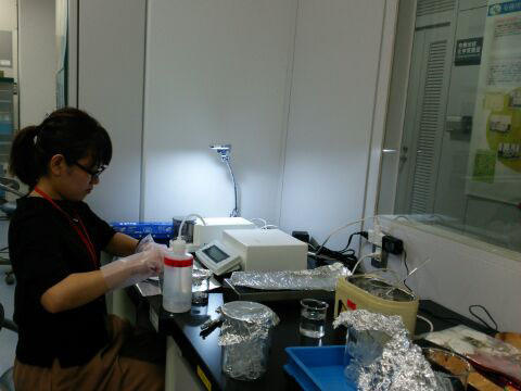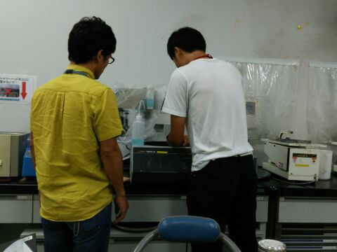 安定同位体担当のG島さんは、試料の秤量をしています。充実の設備です。初日の作業はこれで終わり。
