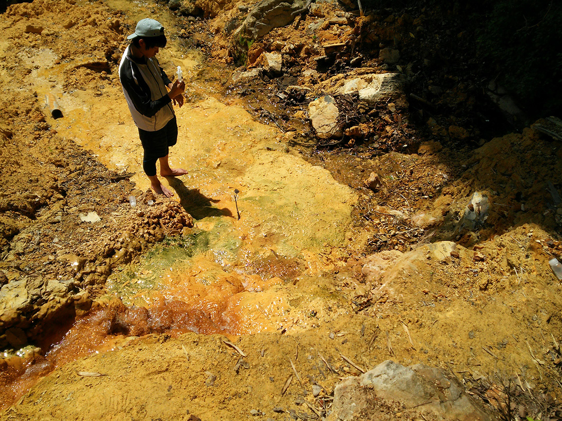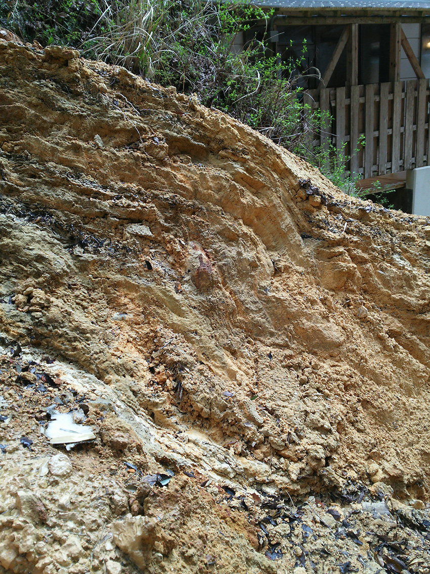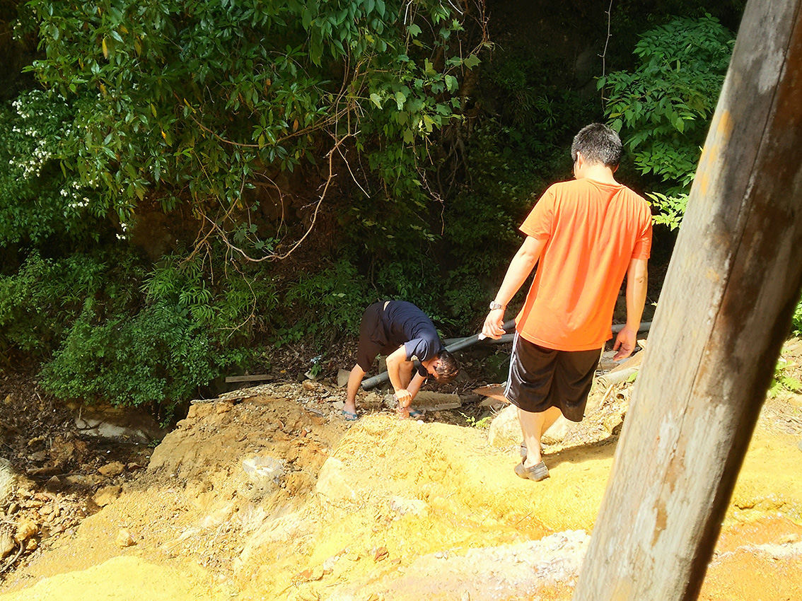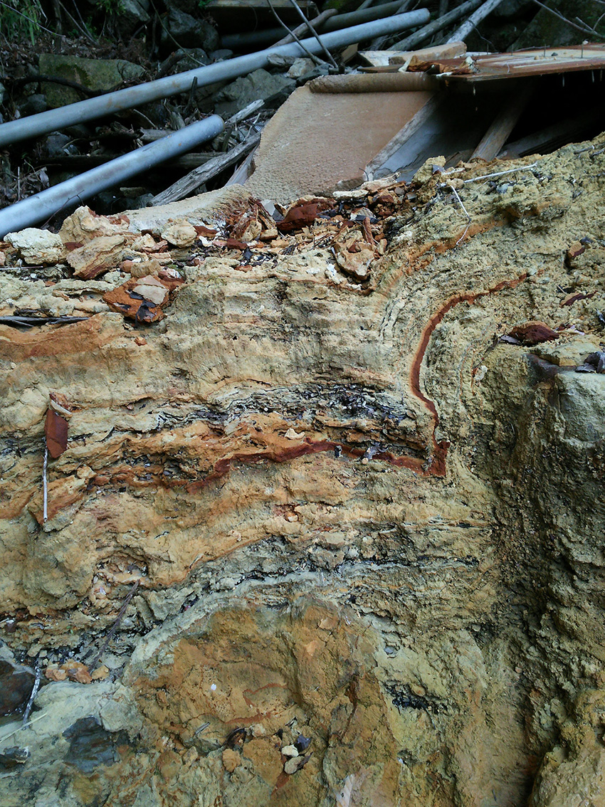 今年の1月に削り取られた堆積物の断面。鉄の層がはっきり写っています。堆積物は溜まり過ぎないように、5~6年に1回のペースで削り落としているとのこと。このくらいの期間に2m堆積していることになります。
