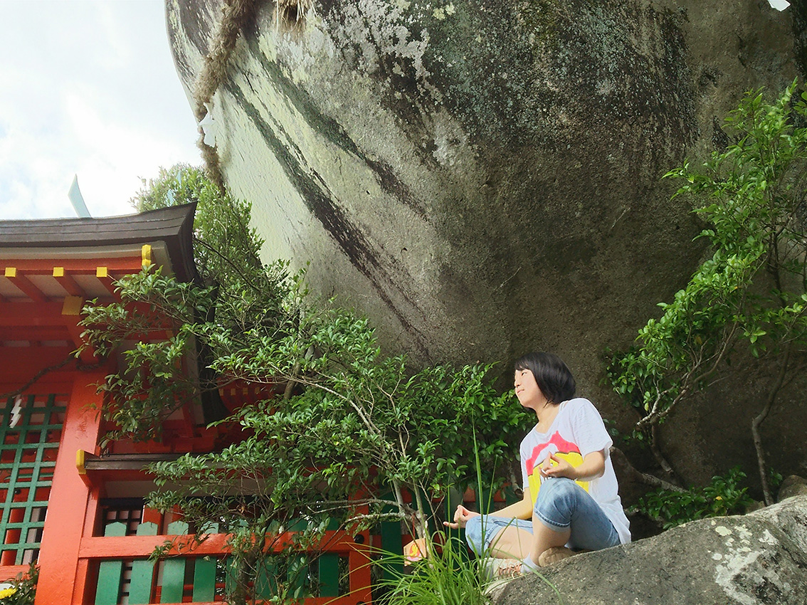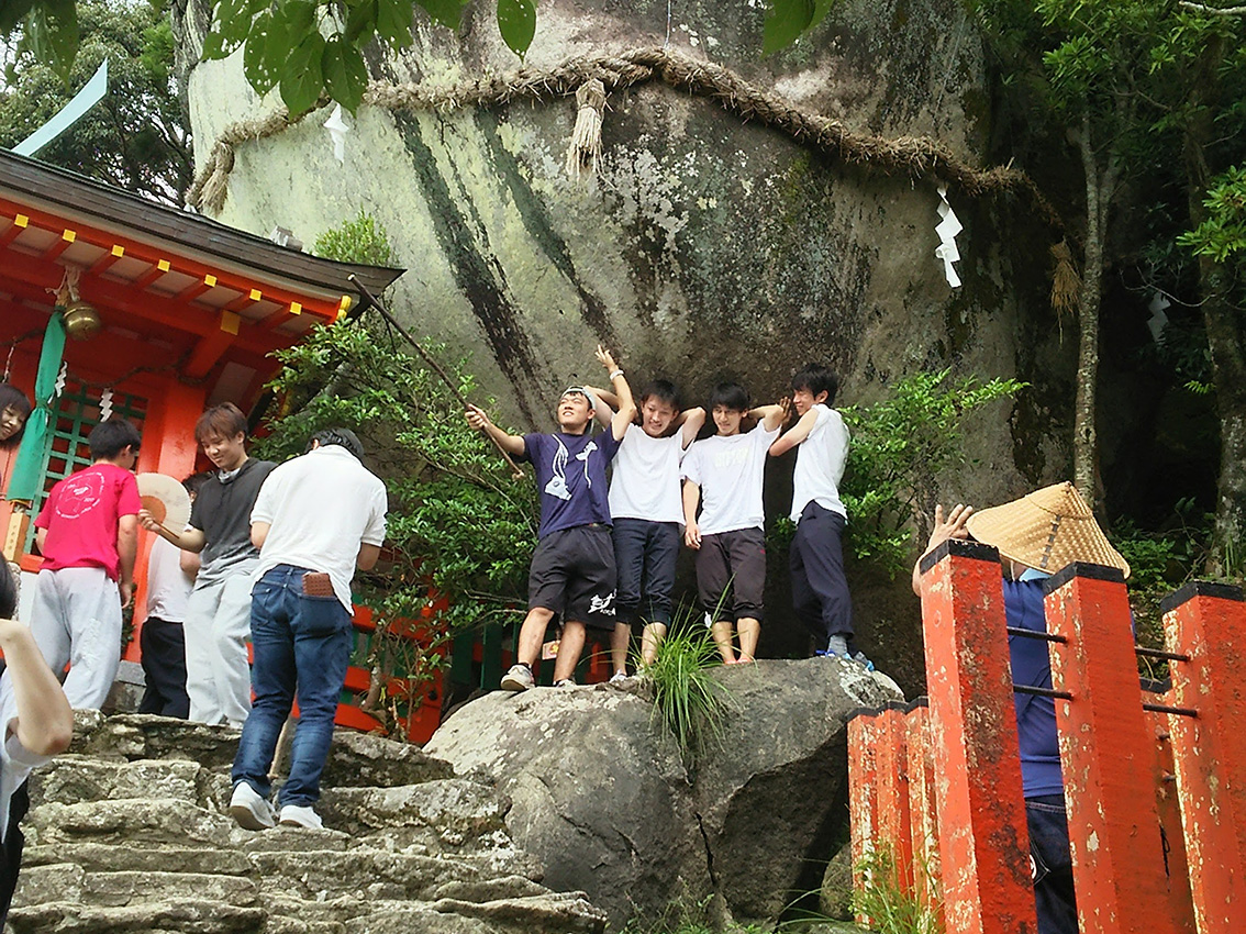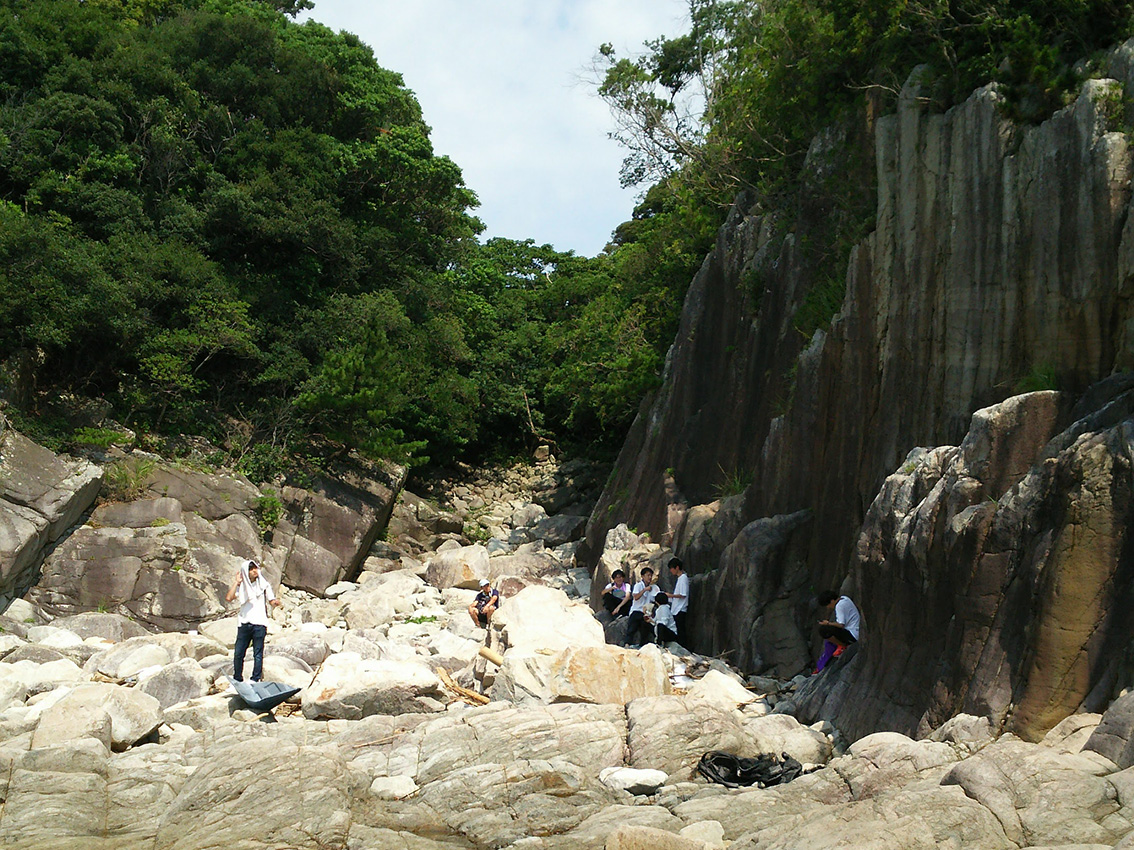 左)目的の風化花崗岩(オニオンクラック)の下でガイドのおじさんに言われるがままに大地の鼓動を感じる学生さん。右)男の子ver.皆さん、お疲れ様でした。