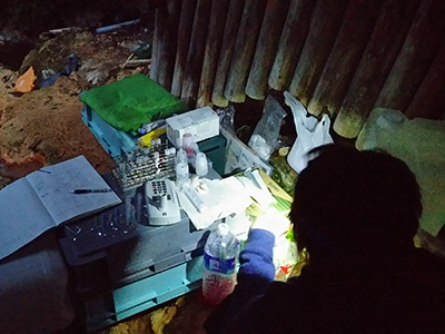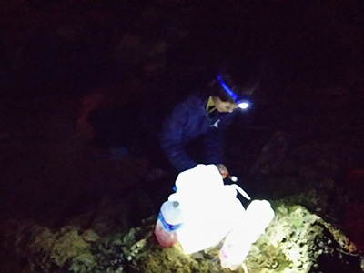 左)ヘッドライトで作業するM原さん。右)外が白んできた。
