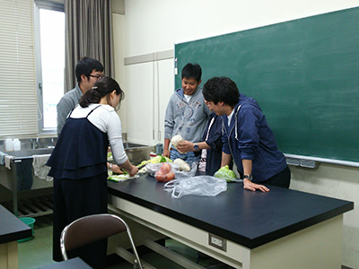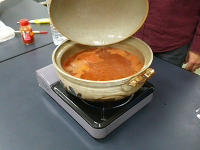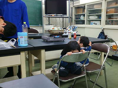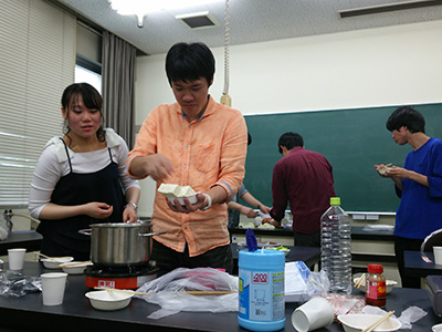 さて、大学に戻って鍋の準備。まじめに授業に出ていた3回生も合流です。キムチ鍋とごま豆乳鍋を用意してくれました。
