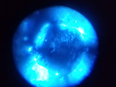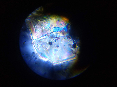 答えは、左が食塩で、右がグラニュー糖です。食塩は光学的等方体なので、クロスニコルでは黒く影になって見えます。