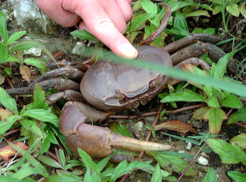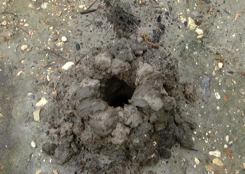 田圃のあぜ道を歩いていたカニ! 右の巣のようなものがあぜ道に点々と続いている…。