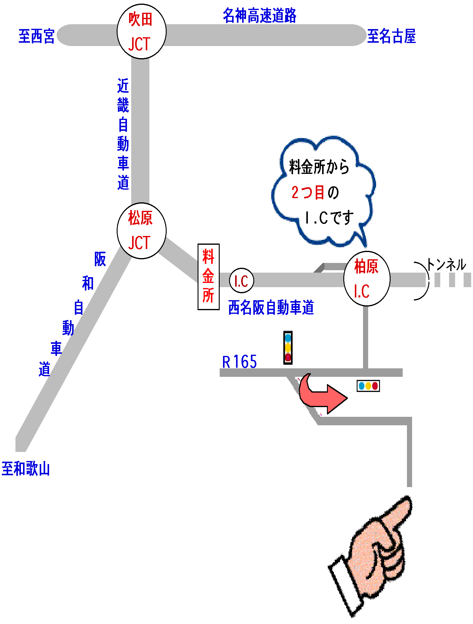 西名阪自動車道香芝ICで降り大阪方面(165号線)に合流。あとは柏原IC乗り口の信号を通り過ぎ、次の信号を左折(大学への登り道で急な左折です)。
