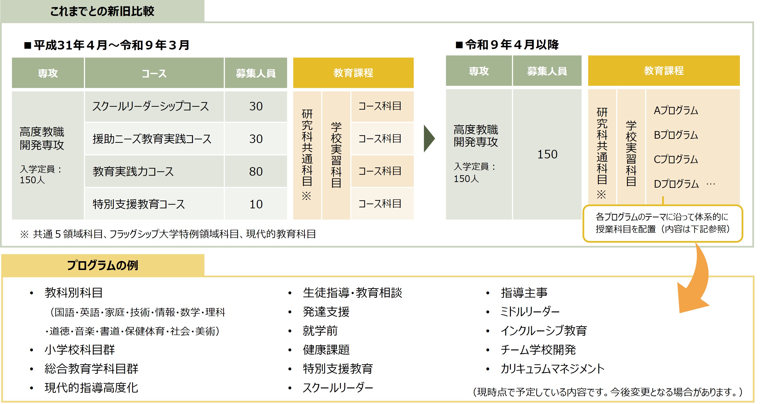 本学教職大学院では、これまで4つのコースに分けて入学者選抜を行い、コースごとに教育課程を実施してきました。しかし、近年はコースの枠を超えた多様な学びのニーズが高まっていることから、院生が持つそれぞれの教育課題に即して、より主体的かつ柔軟に教育内容を選択することができるよう、令和9年度から従来のコース区分を撤廃し、プログラム制へ移行します。