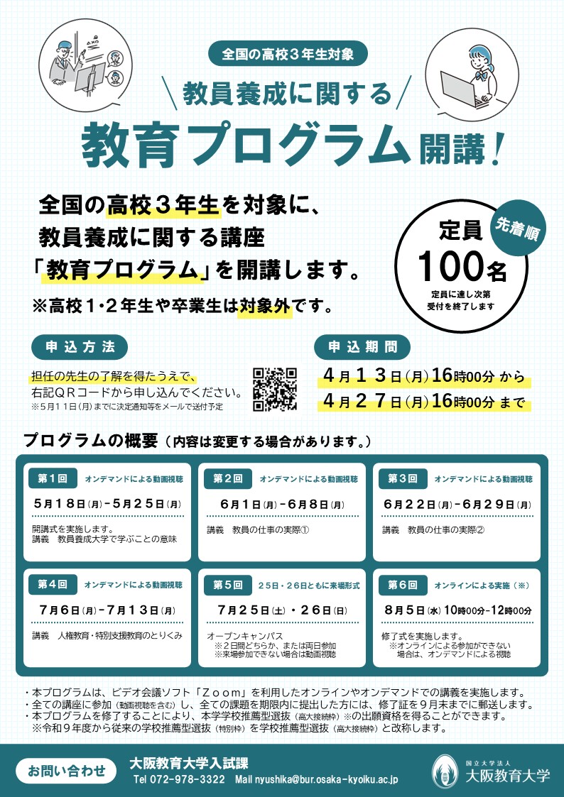 本学では全国の高校3年生を対象に教員養成に関する講座「教育プログラム」を開講しています。この「教育プログラム」は、令和9年度学校推薦型選抜(高大接続枠)
