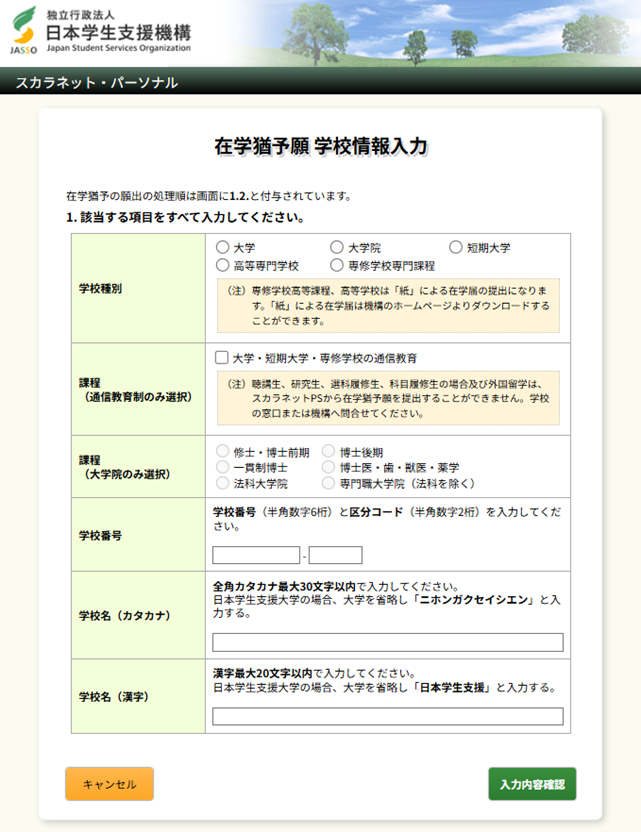 ※スカラネットPSのユーザー登録がまだの方はユーザー登録を行った後に在学猶予の手続きを行ってください。(スカラネットPSのユーザー登録についてはこちらを参照してください。)