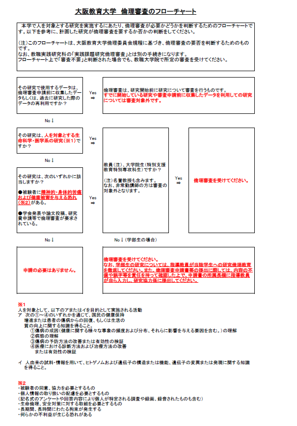 本学の研究者等(学生等を含む)の行う教育、研究、地域活動等のうち倫理上の問題が生じるおそれのあるもの及びその研究活動等の結果を公表する場合は、ヘルシンキ宣言(1964年6月第18回世界医師会総会採択)の趣旨に則して倫理的に実践されているかどうかについて、大阪教育大学倫理委員会規程に基づき、研究等開始の前に本学倫理委員会において審査を行う必要があります。