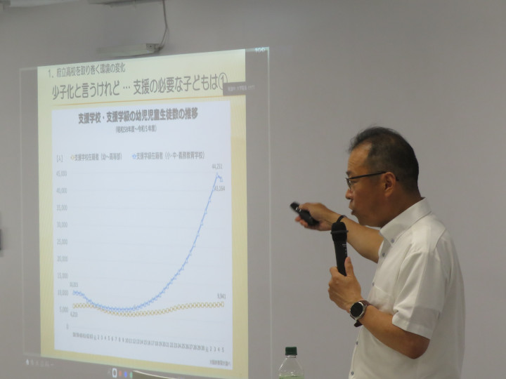 大久保教育監からは、少子化が叫ばれている一方で、特別な支援を要する児童生徒が増加していることによって、特別支援学校は新設をしていることや日本語指導が必要な生徒は増加し続けており、新たな対応が必要となっていること、昼間の全日制の学校以外への進学者等のニーズ変化や不登校の生徒に対する支援の必要性等、大阪府の高等学校を中心に取り巻いている環境が変化している現状の説明がなされました。