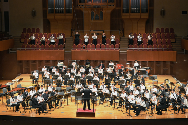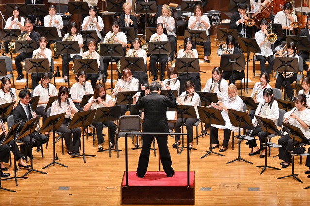 教育協働学科教育コミュニティ支援専攻芸術表現コース(音楽分野)で管・打楽器を専攻する学生らによるウインドオーケストラが9月12日(金)、ザ・シンフォニーホールでスペシャルコンサートを開催しました。第9回となる今回は、昨年に引き続き特別ゲストとして人気作曲家のコーニッシュ氏とNHK交響楽団首席クラリネット奏者の松本健司氏を迎え、客演指揮・奏者として全国各地の大学から音楽教員8人と40人を超える学生が参加しました。