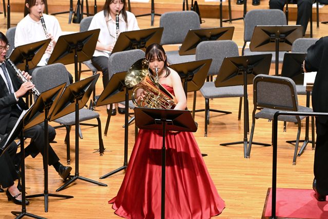 後半では、A.リード作曲『春の猟犬』を同志社女子大学の牛渡克之教授の指揮で演奏したあと、Osaka Shion Wind Orchestraのユーフォニアム奏者で本学非常勤講師の岩井田さくら氏による独奏で、コーニッシュ作曲『Yukucia』を演奏しました。演奏を終えて岩井田氏は「ユーフォニアム協奏曲と聞いてしっとり優しい雰囲気を想像していたら、まさかのサンバでびっくりでした。ユーフォニアムの新しい風を吹かせる作品に出会えて本当に良かったです」と感想を述べました。最後はP.スパーク作曲『宇宙の音楽』の壮大なハーモニーで締めくくりました。
