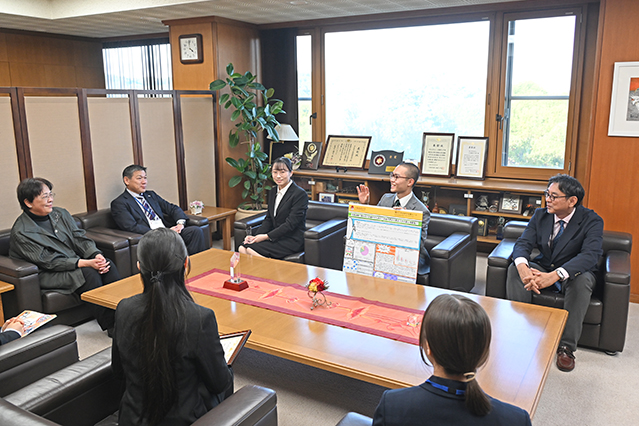 岡本学長は「受賞はとても喜ばしいことですが、こういった一つの目標に向かって専攻の異なる仲間で時間を共有しながら進めていくプロセスが大切だと思いました。また、みなさんの支援活動をいろんな世代の方たちに知ってもらうのも必要かと思いますので、大学の広報を利用して発信していってください」と話しました。サポート学生代表の教育協働学科理数情報専攻自然科学コース2回生の石岡奈月美さんは「今回はポスター制作にあたって、初めて学内アンケートに取り組みました。回答していただいたみなさんをはじめ、多くの方々にご協力いただけたことが受賞に繋がったと思います」と受賞の喜びを語りました。