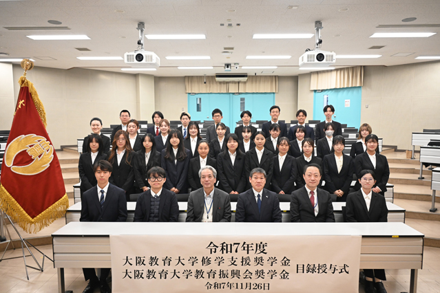 大阪教育大学修学支援奨学金(*1)及び大阪教育大学教育振興会奨学金(*2)の目録授与式を、11月26日(水)に柏原キャンパスで挙行しました。