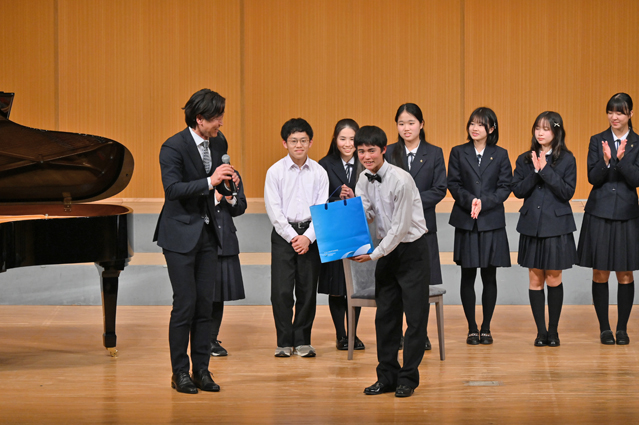 終演後には、同社よりオペラセッションに参加した生徒へ記念品の贈呈が行われ、最後に藤井睦子理事・副学長(附属高等学校長)が閉会の挨拶を述べ、プログラムを締めくくりました。