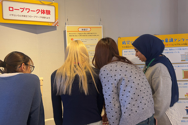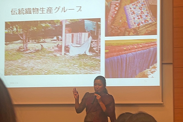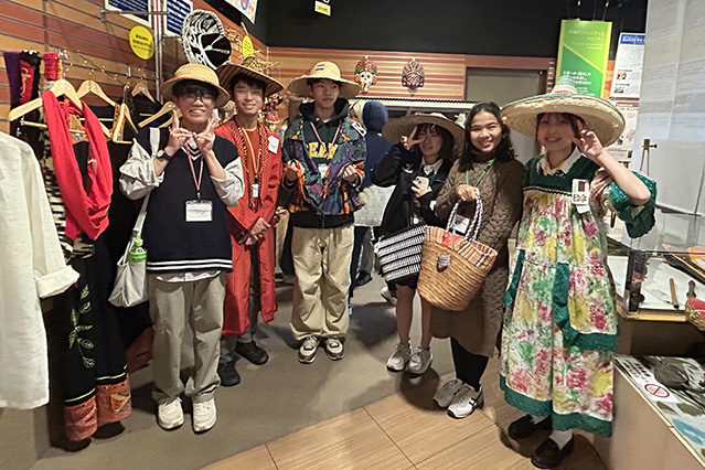 JICA関西は、JICA国際協力機構が日本全国に設置する15の国内拠点の一つで、関西圏の窓口となっている機関です。JICA関西職員の事業説明の後、留学生を交えたグループに分かれ、軽食をとりながら社会課題や国際協力について英語で意見交換を行いました。その後、施設見学を行い、民族衣装の着付け体験や民芸品、SDGsに関わる物品に触れながら、多様な課題について学びました。続いてラオスに駐在経験のある隊員からボランティア体験談を聞きました。現地の生活や文化の紹介に始まり、特産物を生かした経済活性化への支援や緊急性の高い社会課題である地雷の除去活動について説明がありました。参加者はラオスの現状を知ることで、国際協力において自身が取り組めることを具体的に考えることができました。