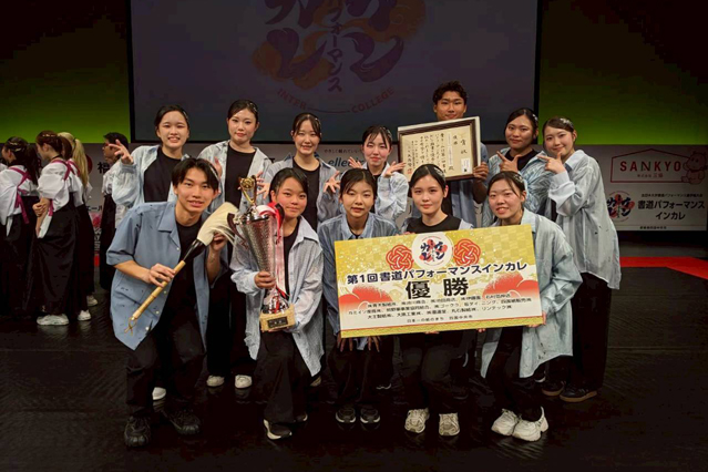 全国の大学生が書道技法とパフォーマンスの総合力を競う「第1回全日本大学書道パフォーマンス選手権大会」が、3月8日(日)に愛媛県の三島運動公園体育館において開催され、教員養成課程教科教育専攻美術・書道教育コースの有志学生11人が優勝を果たしました。