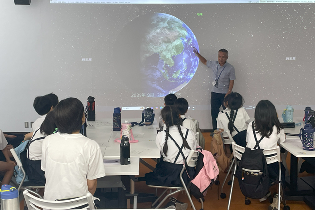 壁面全体に映し出した映像で太陽系の動きを解説する仲矢副センター長