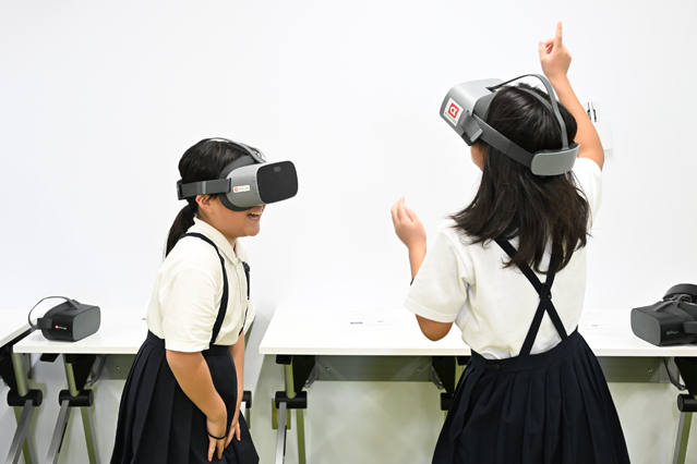 授業の最後に、児童はグループに分かれて授業の体験をもとに「未来の学校」について話し合い、発表しました。ワークシートには「VRでタイムスリップして、昔の人物に話を聞くことができる」「現実には危険で難しい実験をVRで学習できる」「遠くの学校の人や被災地で学校に行けない人とも同じ空間で同じ勉強ができる」「AIロボットが授業で難しい問題の解き方のヒントを教えてくれる」「AIがVRの中で自分に合わせた授業をしてくれる」など、未来の学校についてのさまざまなアイデアが寄せられました。