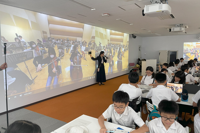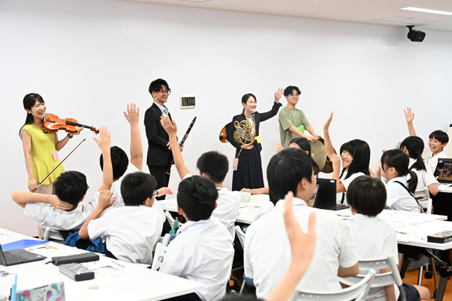 中野特任教授は、⽣魂⼩学校の5年⽣が主⼈公となる冒険映画をテーマにしてAIが作成したポスターや予告編映像、主題歌などを紹介したほか、⽇本語や英語でAIと会話するなど最新のAIの実力を子供たちに披露しました。仲矢副センター長は、みらい教育共創館の未来型教室の設備を用いて壁面全体に映し出した映像で太陽系の動きなどを解説しました。相原共同研究員は、株式会社アルファコードの協力を得て制作したVR映像と実際の楽器演奏を組み合わせ、楽器やオーケストラについて学ぶ授業を行いました。楽器は、豊中市立庄内南小学校の須賀かおる教諭(バイオリン)、教育協働学科芸術表現専攻音楽表現コースの安田凌一郎さん(クラリネット)、同コースの齊藤縁さん(シンバル)、相原共同研究員(ホルン)が演奏しました。