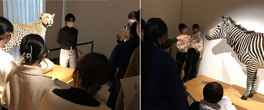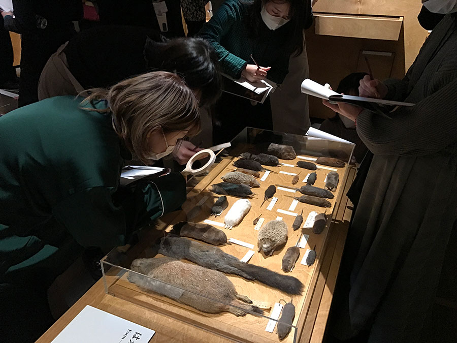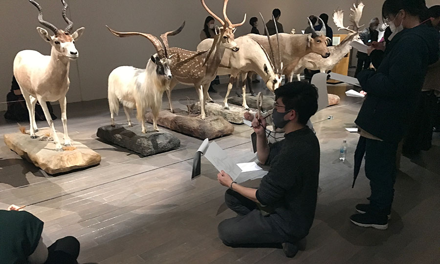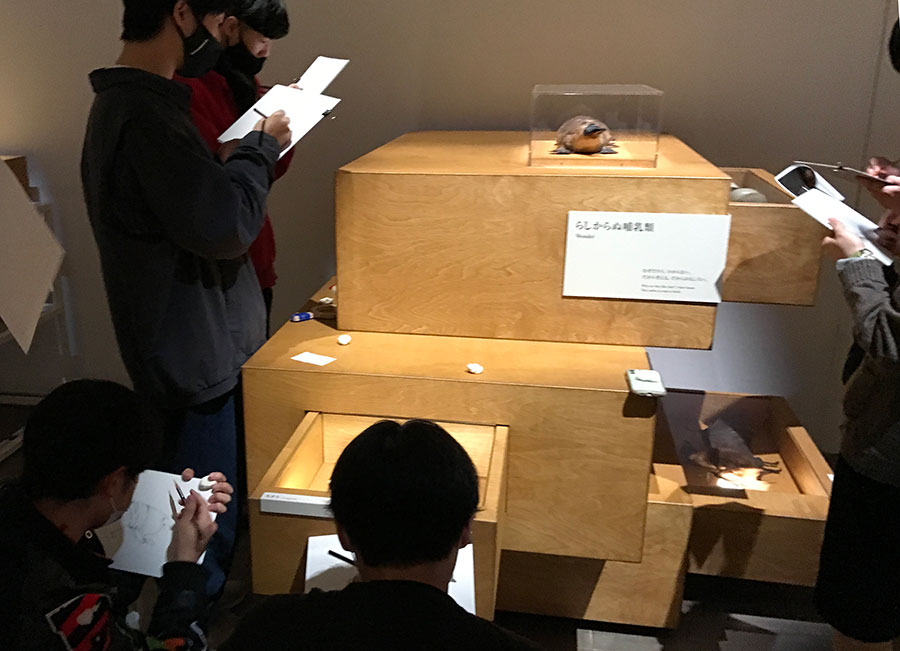 「らしからぬ哺乳類」展示コーナーでスケッチをする学生の様子