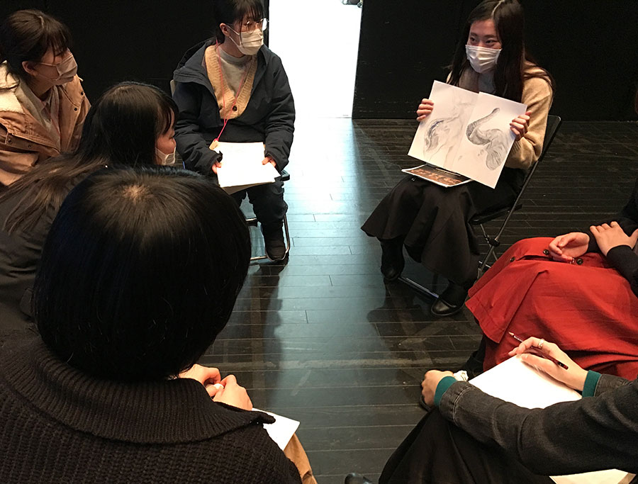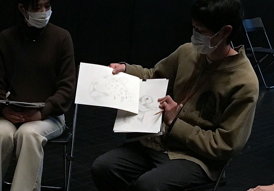 金沢21世紀美術館ギャラリーBで開催された展覧会「WHO ARE WE 観察と発見の生物学」を活用し、ミュージアムコミュニケーションの可能性を研究するプログラム『ダ・ヴィンチ講座「観察の眼 発見の目」』に、「アート と ともだち」制作チームが研究協力として参加しました。本研究講座では、国立科学博物館所蔵の動物の剥製や模型を展示した9つの什器(私たちは誰なのか・哺乳類とは何か・らしからぬ哺乳類・まさかの細部・ちがいの整列・はえている道具・からだのなかの彫刻・わたしたちも建築家・かもしれない模様)を5グループに分け、大学生・専門学校生45名がそれぞれ興味を持った展示場所に分かれ鑑賞しました。各グループにはサイエンスコミュニケーター1名をファシリテータとして配属し、対話を通した鑑賞を通して展示物の観察の視点が変化することについてスケッチをもとに発表し合いました。活動は閉館前までの18:00〜20:00の3時間で実施し、観察の手助けとなる鑑賞ルーペも配布しました。絵画や彫刻などの美術作品のみが鑑賞の対象となるのではなく、広く私たちの感性を刺激する自然も鑑賞対象となります。仲間と一緒に鑑賞することで得られる発見やスケッチをすることによる鑑賞の深まりを実感しました。(2023年2月2日実施)