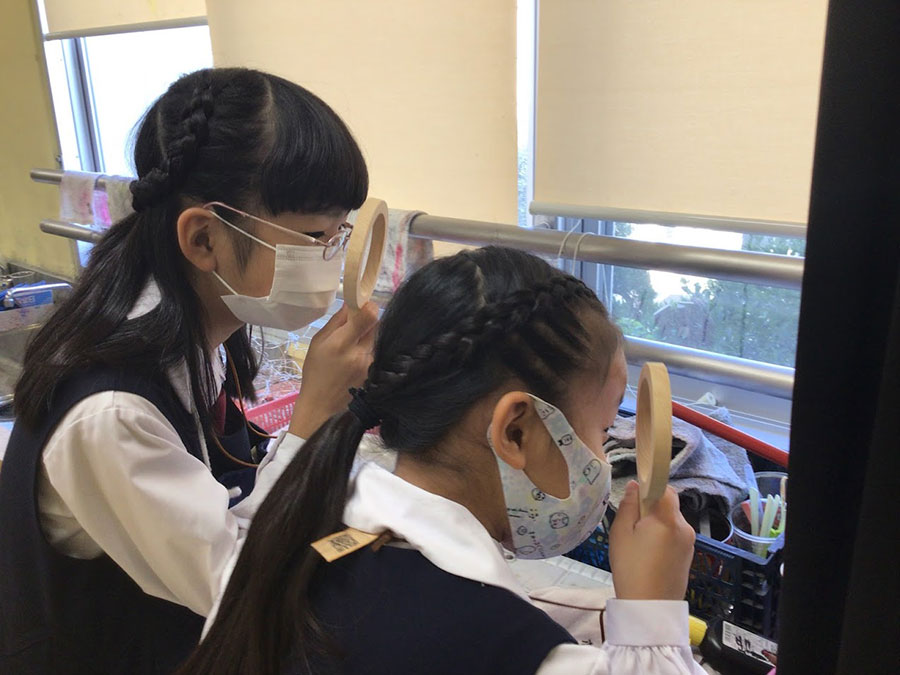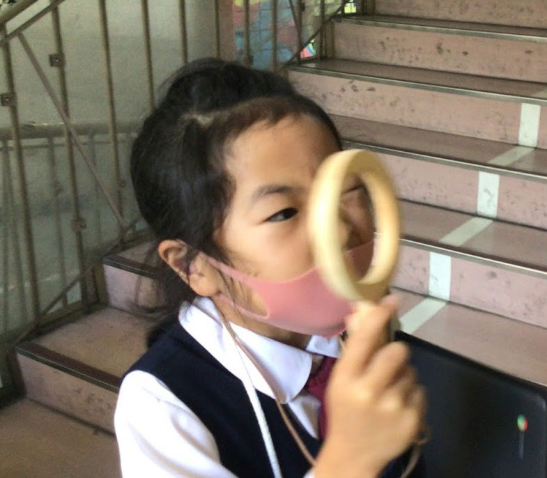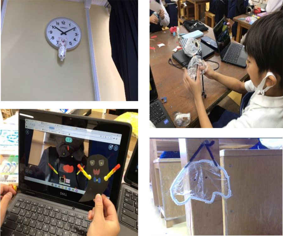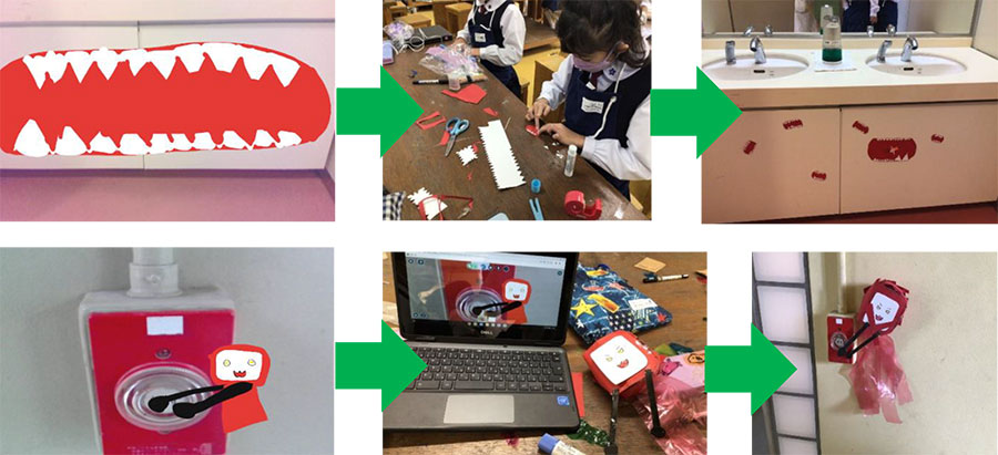 「学校にようかいがいるかもしれない?」鑑賞ルーペでようかいを探しに探検に出ると、普段は見えないようかいが見えてきました。「階段の下の暗い所では、三角の形のようかいが階段を支えているんだよ。」「非常ベルには、ベルを押せないようにする赤いようかいがいるかも?」場所の感じや特徴に合ったようかいを思い付いて、写真にイメージをかいていきます。場所に合ったようかいをつくるには?「透けているようかいをビニールでつくったよ」「やわらかいようかいの体を袋にお花紙を入れてつくったよ」「ようかいを置いてみたら場所にピッタリだったよ!だれかがおどろくかも」。鑑賞から表現へ活動を展開しました。(2023年1学期実施)