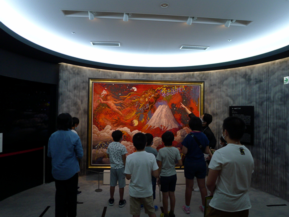 作品の前でキュレーターが「どんな色が使われているかな?ルーペを使って探してみよう!」と促すと、子どもたちは画面に近づいてルーペをかざし、近づいてよく見ると沢山の色が使われていることにとても驚いていました。作品の色彩の豊富さに気が付いた子どもたちは、その後も鑑賞する作品毎にルーペを使って色の発見を楽しんでいました。(2020年8月実施)
