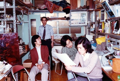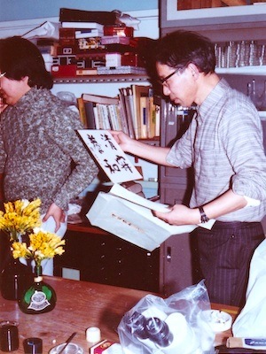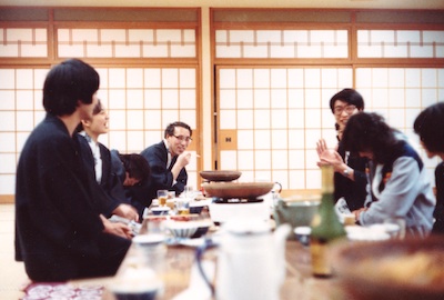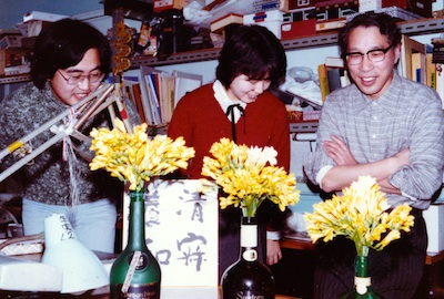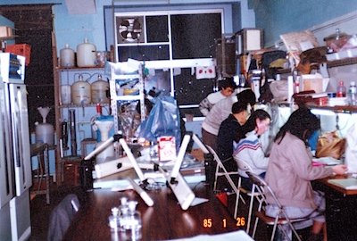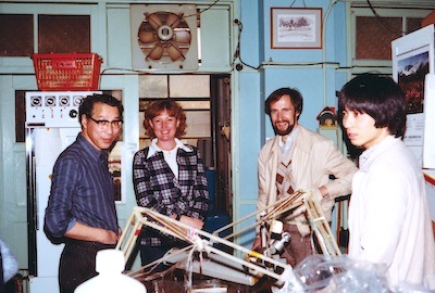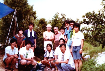 「.... 当時は大所帯で、特に私が3回生の頃は加藤先生のお部屋(当時私たちは、なぜか奥の院とよんでいましたが)に、先生をはじめ教務員の井上さん、院生の出野さん、専攻科生の藤野さんの4名、学生の部屋には、3,4回生合わせて8名という構成でした。そのうえ、助手の先生方はほとんど一研の住人(?)のようでしたし、武内さん、加賀さんはじめ先輩方も毎日誰かが来られて仕事をされているという状態でした。特に一研では、夜間の人口密度が高く、学生部屋の大机では今まで染色で走りまわっている人がいたかと思うと、突如として酒盛りがはじまったり、目は顕微鏡をのぞきながら、耳は先生方や先輩方の話を聞いていたりということがしょっちゅうでした。仕事をするために、いろいろな方が加藤先生のところに集まってこられて、雑然としながらも活気にあふれ、本当に心地よい場所でありました。