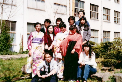 「 この冊子作成のお知らせをいただいて、何年かぶりに卒論をひっぱり出しました。....書棚の中を必死に捜しました。.....約30分後、一番下の段に置いてあるカセットテープ入れの後ろに、大きな本の間にはさまれている卒論を発見しました。やった〜、とばかりに片付けもせず、卒論を読み始めました。本当にじっくり読むでもなく、ただめくるだけでもなく。・・・&%$#!?。ふ〜ん、こんな事やっていたんやなー。でもね内容については、細かいことはほとんど思いだせない。読みながら思い出すのは、先生の笑った顔、きびしい真剣な顔、同年次卒の谷本さん・松本さん・鳩山くんやいろいろお世話になった先輩方の顔。そして、若干の授業の場面や研究室での研究の場面。これらが、整理していないアルバムを見ているように、一カットずつ絵のようにしか浮かんでこないのです。....
