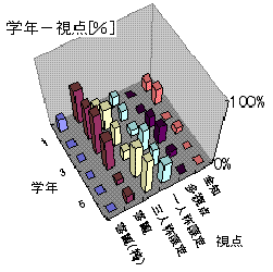| ・3年生 | : | 客観が54%を占め、ついで三人称限定が23%を占める。また多視点が15%を占め、この学年から多視点がみられる。 |