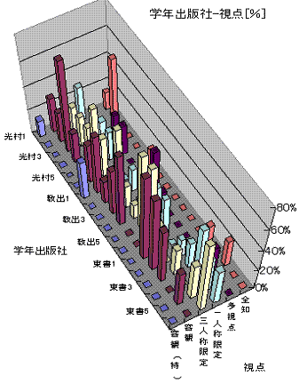 | ●東京書籍 | : | 客観が42%と最も高い割合を示している。一人称限定の25%が三人称限定の21%を上回っている。客観(特)は3社中唯一みられない。 |