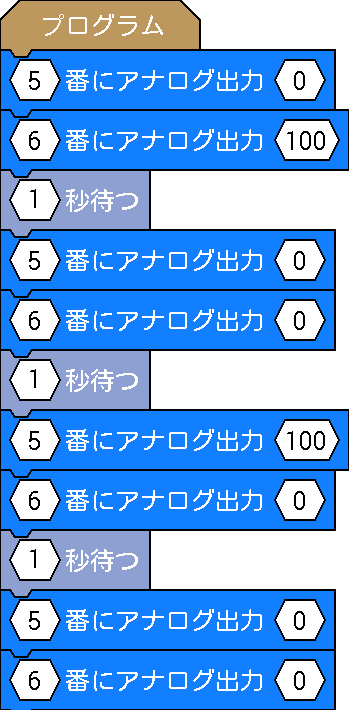 このプログラムを実行するとモータが1秒間回転して、1秒間とまり、1秒間逆に回転して止まります。モータの回転数が18番のプログラム例より遅くなります。