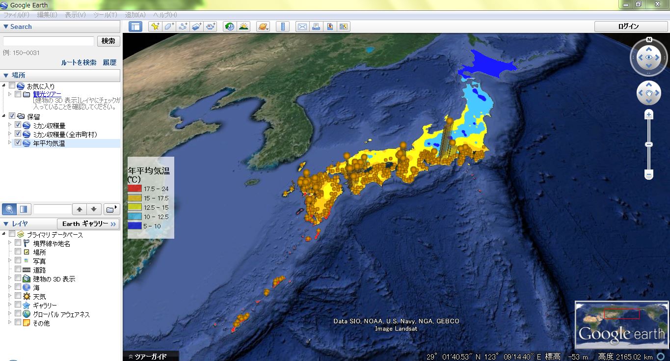 を,クリックまたはタップします.そして,PCでは「開く」を,タブレットやスマートフォンでは「Google Earthで開く」を,クリックまたはタップします.そうすると,下のような,ミカン収穫量の地図に加えて,年平均気温を色で表した地図が,Google