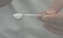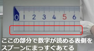 持ち手からスプーンのふちに沿って、定規で過剰な食塩を落とします。(この時、定規で食塩を押しつぶしてはいけません!)