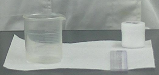 @ 食塩のふたを開けて、計量スプーンと定規、ビーカーを用意します。(この実験では定規を使用していますが、水平な棒状のものであれば構いません。本来はすりきり用の「へら」が好ましいのですが、案外売っていないようですね。)